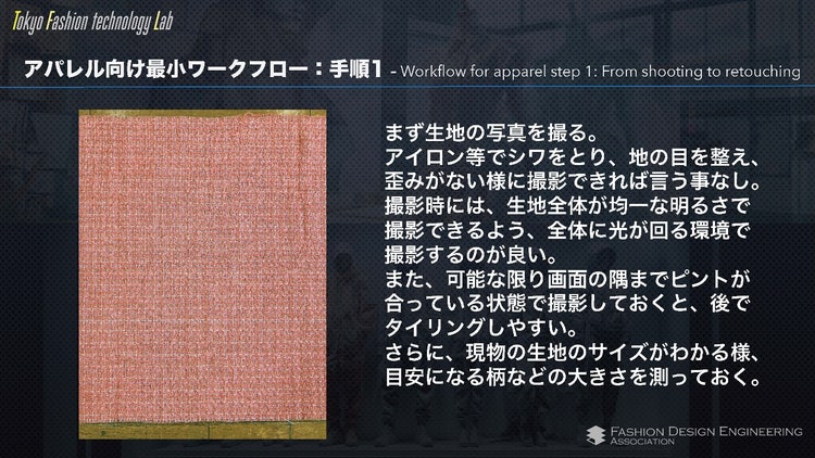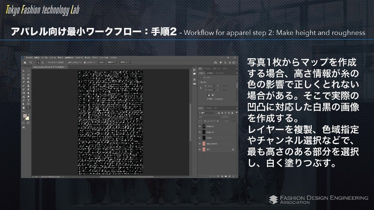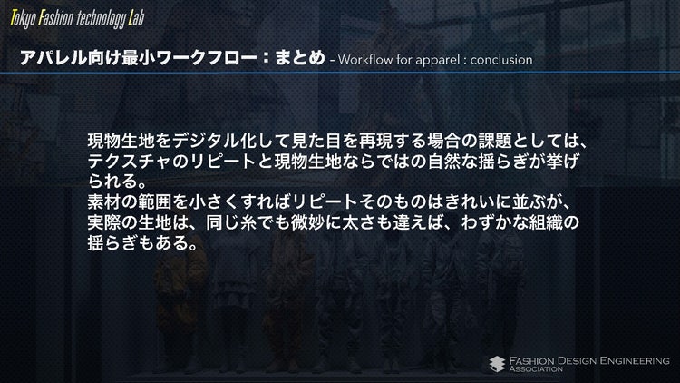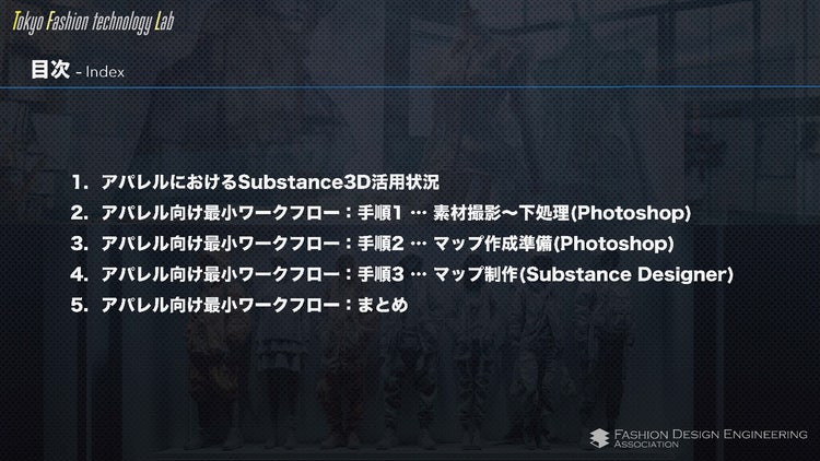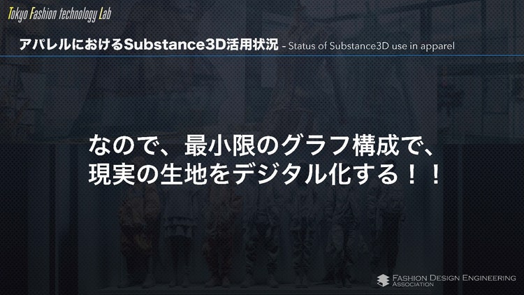 大枠としてアパレル業界におけるSubstance 3Dの活用状況から、実際の具体的な手順までをご紹介いただきました。デジタル化への推進状況やスキャナーなどもご紹介いただきつつ、Substance 3D Designerを使用していきなりマテリアルを作る、というのはやはり難易度が高いという部分に触れられて、それでは 「実際にどのように作るか。」 という部分が非常に興味深く大変参考にするべき方法となっております!