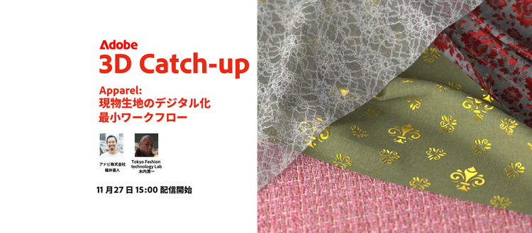 Adobe の3D製品に関するウェビナーイベント Adobe 3D Catch-up の 2025 年第 5 回が 11 月 27 日に開催されました。本ウェビナーは今回が第5回目となる開催で、「現物生地のデジタル化 最小ワークフロー」という建付けの下、木内潤一氏による具体的な活用方法が紹介されました。この記事では、各セクションのポイントを一部抜粋して紹介します。