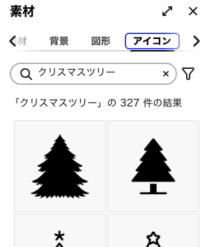 素材の種類は「アイコン」を選択し、検索ボックスに「クリスマスツリー」と入力します。使えそうな素材を選択してクリックすると画面内に配置されます。