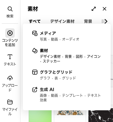 少し素材を加えてバナーを賑やかにしてみましょう。画面左のメニューの「コンテンツを追加」の上にカーソルを移動して、表示されるリストから「素材」を選択します。