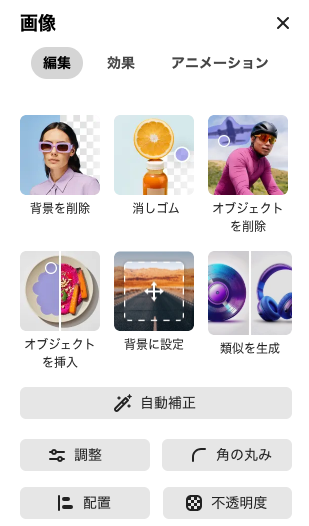 画像を選択して、右下に表示される共有オプションのアイコンをクリックし、リストから「Adobe Express で開く」を選びます。編集画面が表示されたら、左のメニューから「オブジェクトを削除」をクリックします。