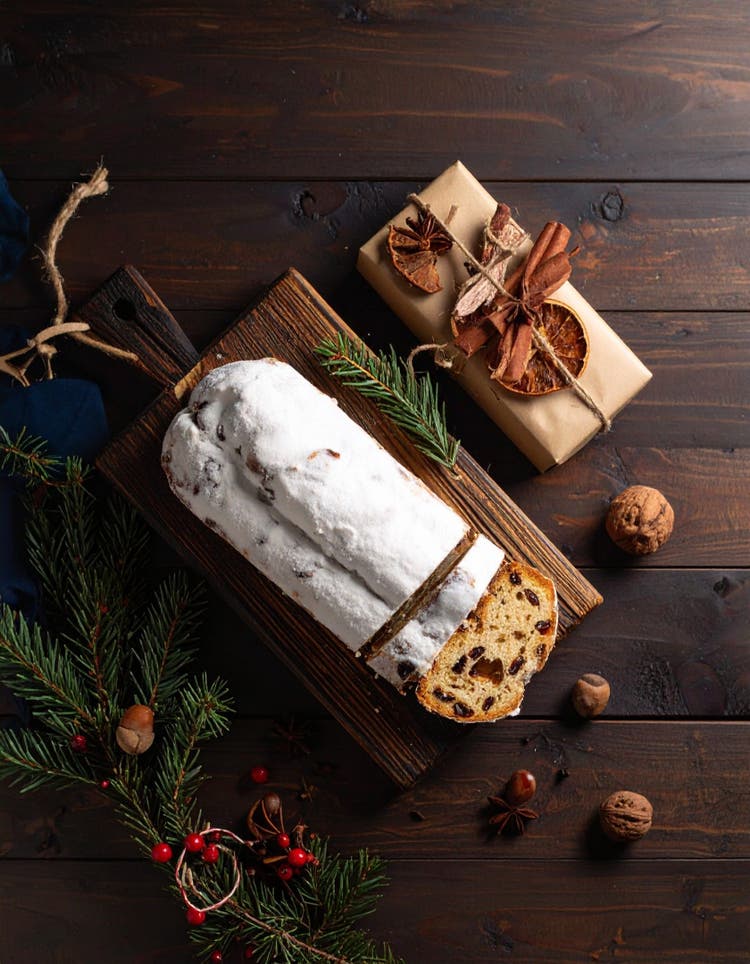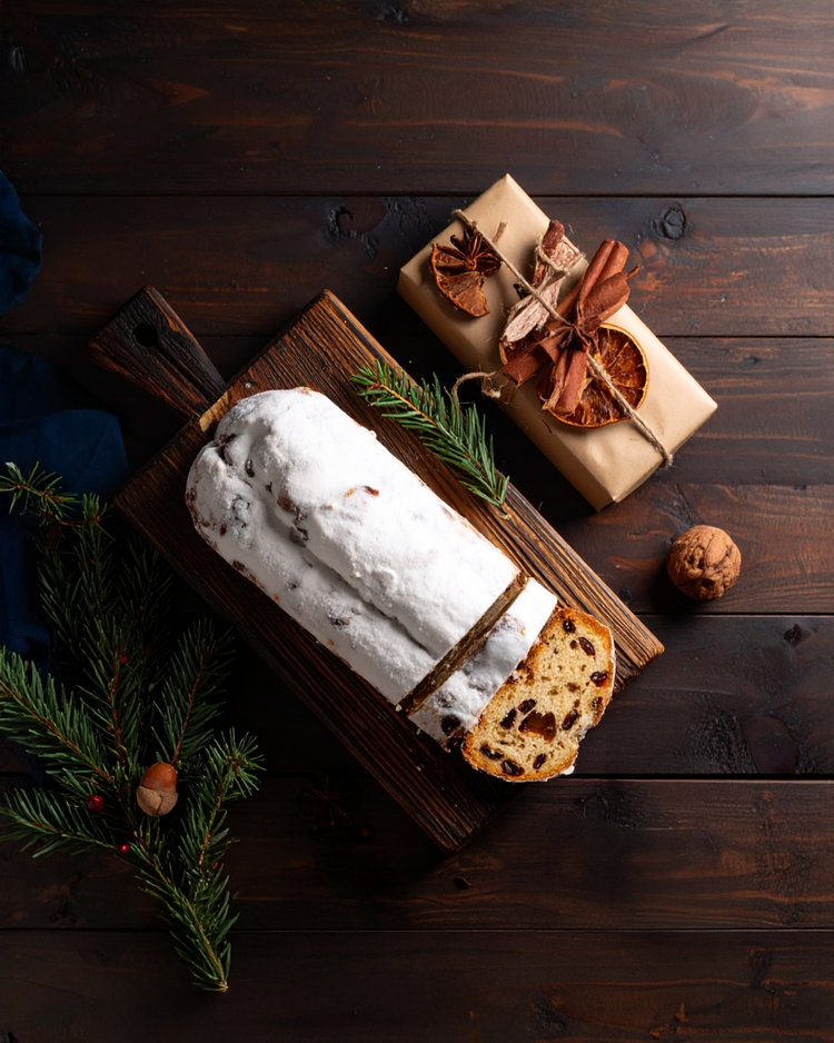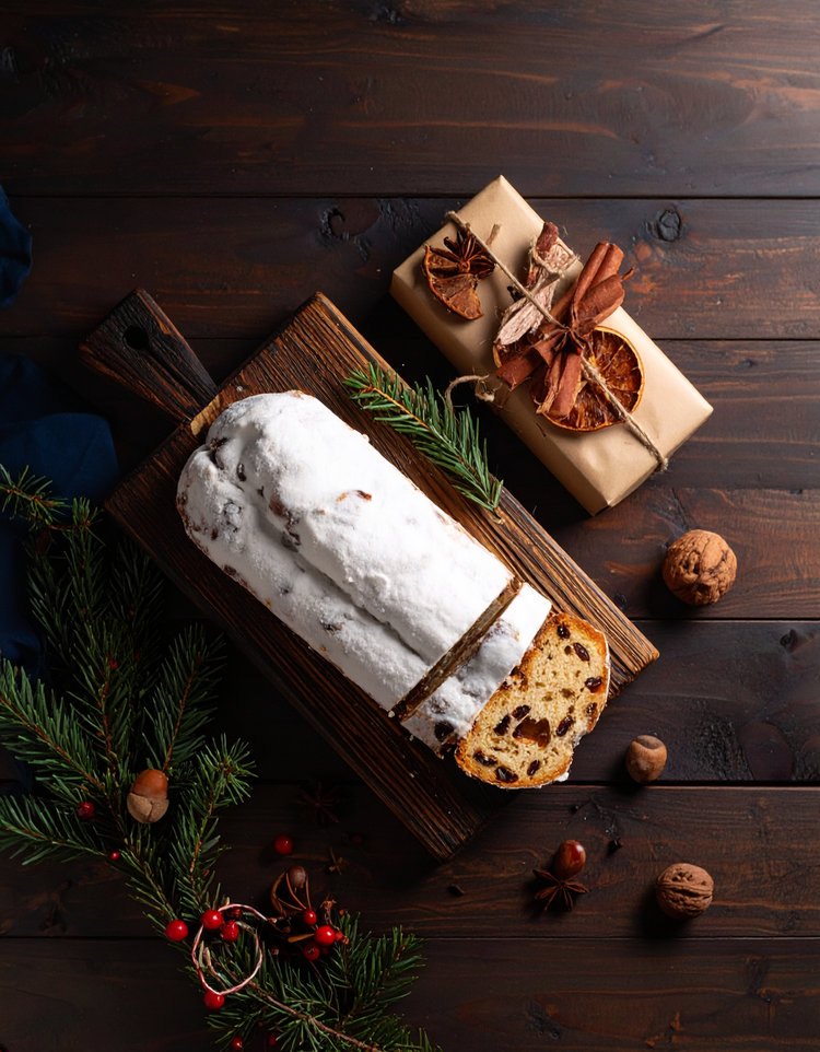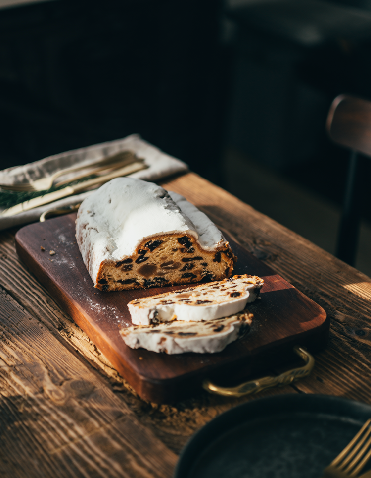 クリスマスらしくなるように、プロンプトは「北欧風のクリスマスのテーブルフォト。木のテーブルの上にシュトーレンが置かれている。影が少し深め。背景はシンプル。少し暗めのトーン。フィルム写真のような質感。」にします。さらに、スタイルの「効果」に「スカンジナビア風」、「ライト」に「微光」、「カメラアングル」に「俯瞰」を指定します。