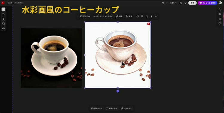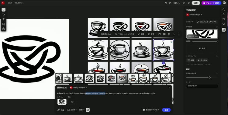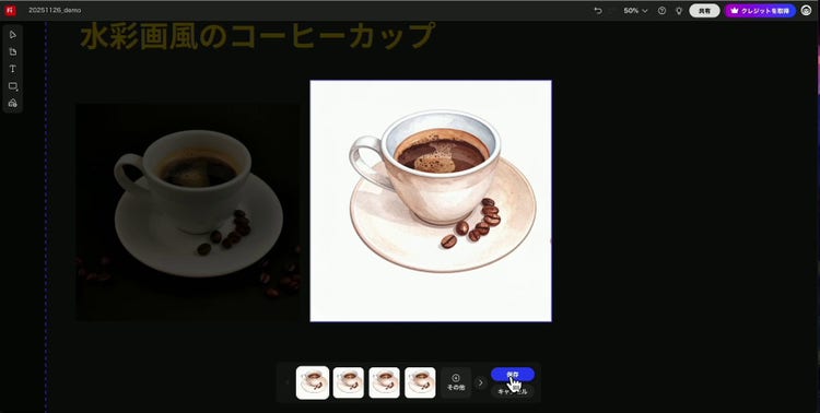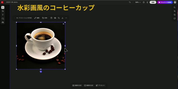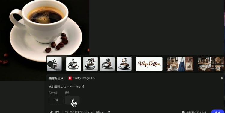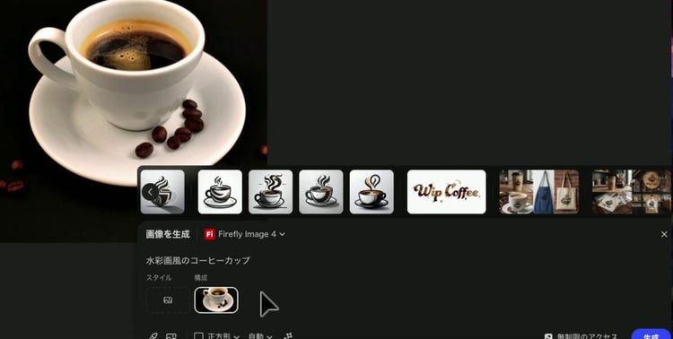 続いて、生成 AI 機能によりこの画像を水彩画風に加工します。「画像を生成」を選択し、プロンプトに「水彩画風のコーヒーカップ」と入力して、モデルを Firefly Image 4 にします。