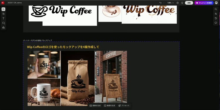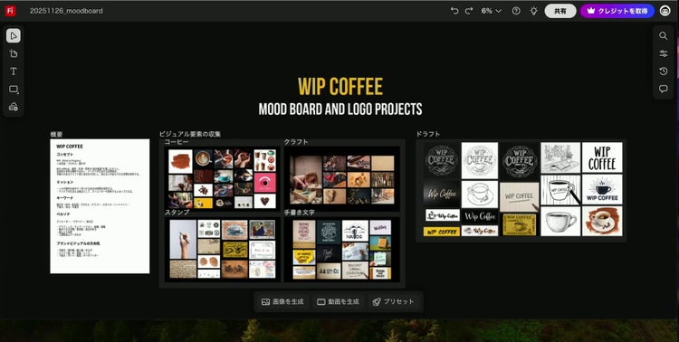 セッションでは、架空のカフェ Wip Coffee のロゴ制作のためのムードボードという設定で、Firefly ボードの使い方が実演されました。以下が用意されたムードボードの全体像です。左はテキストで記述されたプロジェクトの概要、中央は収集され展開されたビジュアル要素をグループ化してまとめたもの、右は作成(生成)されたロゴタイプやロゴシンボルの一覧です。