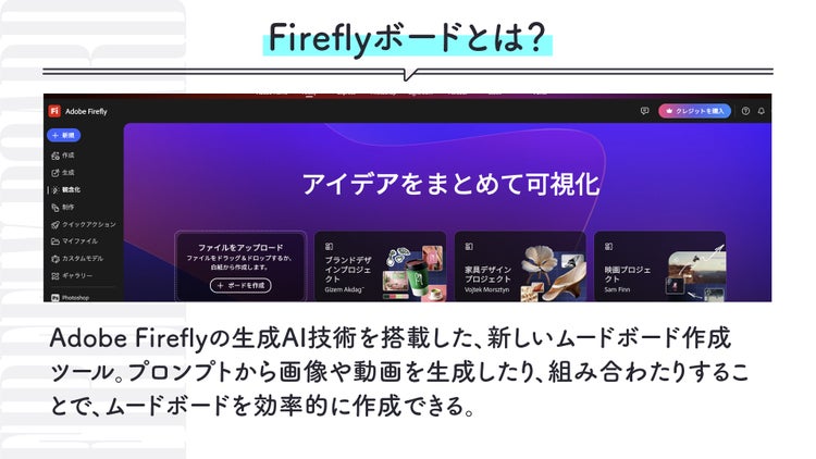 普段はムードボードを制作していないという方も、Firefly ボードにアイデアを並べることから始めてみてはいかがでしょうか?イメージをチームで共有するツールとしての便利さを実感できると思います。