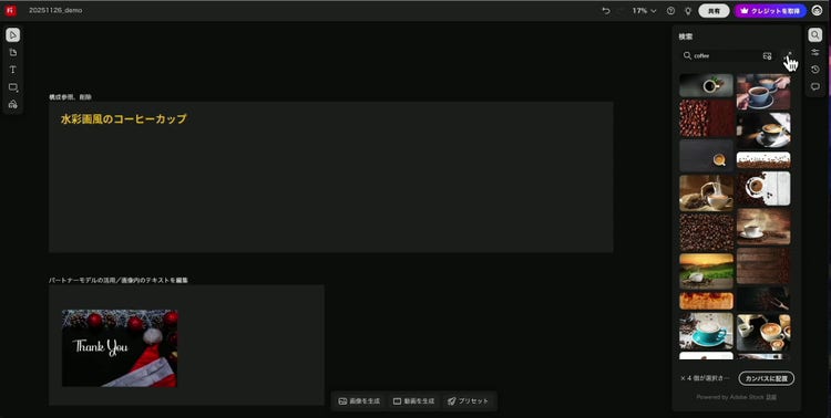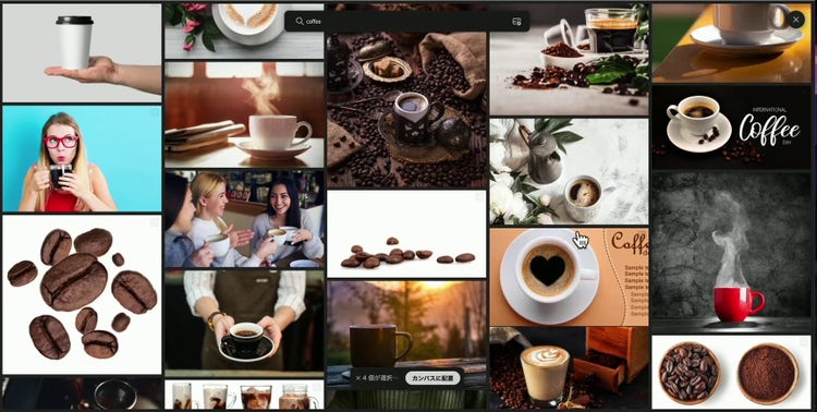 Firefly ボードでは、検索機能から Adobe Stock の無料素材に直接アクセスできます。検索フィールドを使ってアセットを絞ることもできます。下の画像は検索フィールドに「coffee」を入力したところです。画面の右側にアセットのサムネイル画像が表示されています。