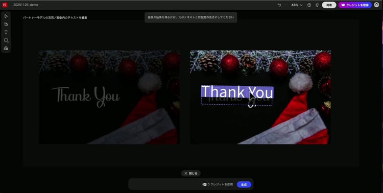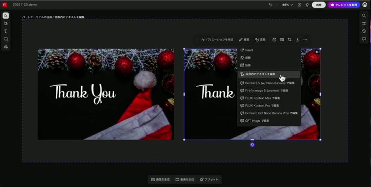 画像内のテキストを編集できる機能もデモされました。画像を選択して、「編集」メニューから「画像内のテキストを編集」をクリックすると、画像内の文字が抽出されて編集可能になります。
