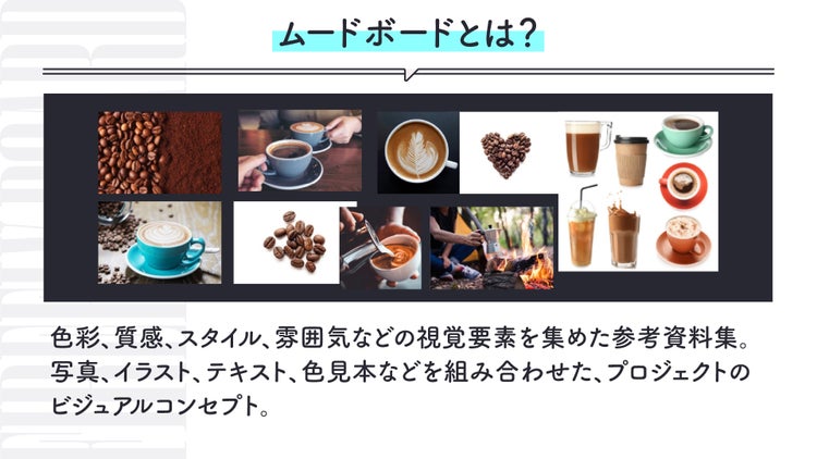 ムードボードは、色彩、質感、スタイル、雰囲気などの視覚要素を集めたプロジェクトのビジュアルコンセプトです。プロジェクトが目指す世界観を、言葉だけではなく、目に見える形で定義します。