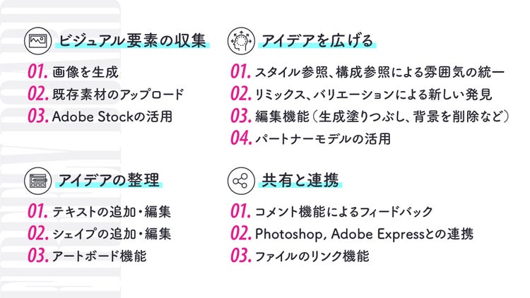 「アイデアの整理」の段階では、テキストやシェイプ、さらにアートボード機能を使って素材を整理し、方向性を明確にします。最後の「共有と連携」の段階では、プロジェクトのメンバーにボードを共有してフィードバックを求めたり、デザイナーと連携してアセット制作に進みます。デザイナーは、プロンプトを使って生成 AI でアセットを編集することも可能ですし、Photoshop web 版などのツールに送ることもできます。