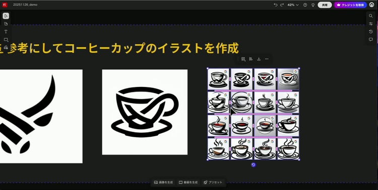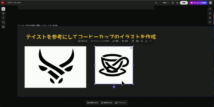 次の例です。下の画像は、パートナーモデルを使用してロゴシンボルを生成した例です。左のベクター風のモノクロのビジュアルを参照して、コーヒーカップのロゴシンボル案を生成しました。