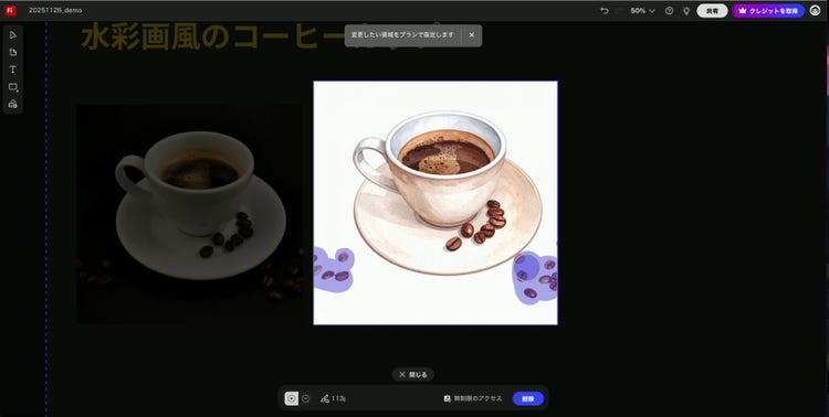 皿の周囲に散らばるコーヒー豆は不要なので削除します。画像を選択した状態で「画像を編集」から「削除」を選択します。すると、ブラシを使って削除したいオブジェクトを塗りつぶせます。