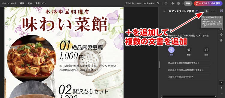 AI アシスタントの欄に表示されている+ボタンをクリックすると、最大で10個のファイルを追加することができます。今回は架空のレストランのチラシを2種類作成し、一部だけわざと文字を変えています。この状態で差分のチェックをしてもらうと...。