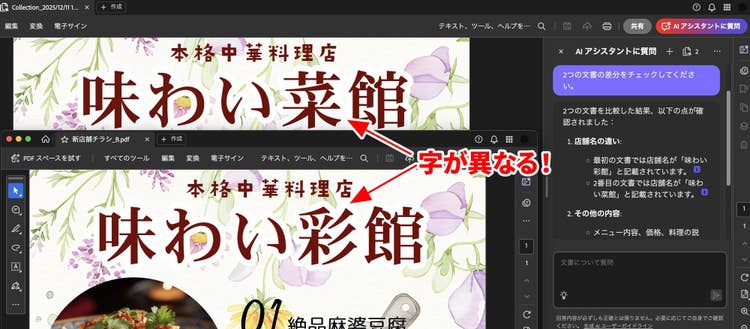 AI アシスタントの指摘通り、「菜」と「彩」で字が異なっていました。こうしたデザインもののテキストチェックは、テキストデータのみを出力してチェックすることもありますが、AI アシスタントならば、完成データをそのままチェックできるので大きな時短となります。