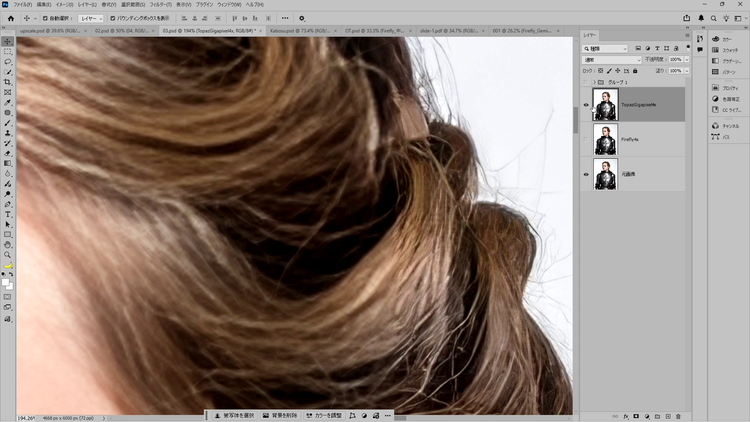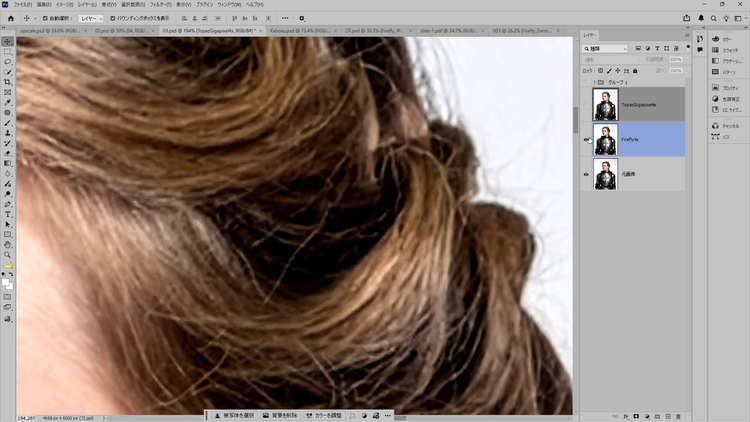 Photoshop で加工する準備としてのアップスケールには Firefly が向いていそうですが、手間をかけずに見た目の良い画像を入手したい場面には Topaz Gigapixel が適していそうです。下は、Firefly(左)と Topaz Gigapixel(右)の出力の比較です。