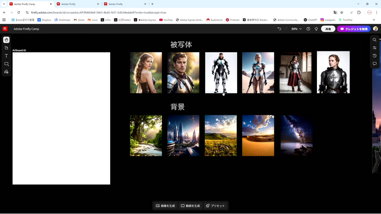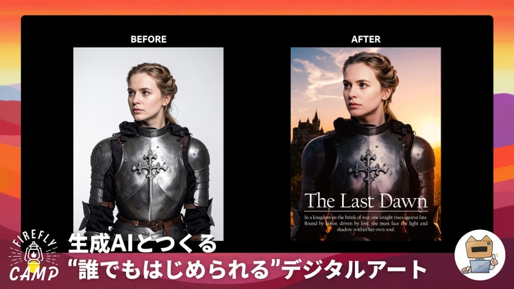 あまりデザイン経験のない方も、合成やレタッチ作業に日々時間を取られている方も、Firefly ボードや Photoshop を使って、「誰でもはじめられる」デジタルアートを試してみてはいかがでしょうか。