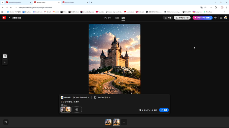 Firefly web 版では、画像生成だけでなく、プロンプトを使った画像の編集が行えます。上の一番右の画像を選び、「夕日で雪を降らせる」と指示して生成されたのが下の画像です。城や草原はそのまま残り、指示した夕日と雪が追加生成されています。プロンプトだけで画像編集ができるのは、スキル的にも時間的にもうれしい場面がありそうです。