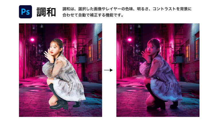 「調和」は、画像やレイヤーの色味、明るさ、コントラストを、背景に合わせて補正してくれる生成 AI 機能です。画像の合成に必要な作業を大幅に簡素化できます。