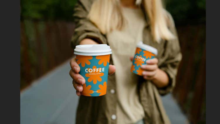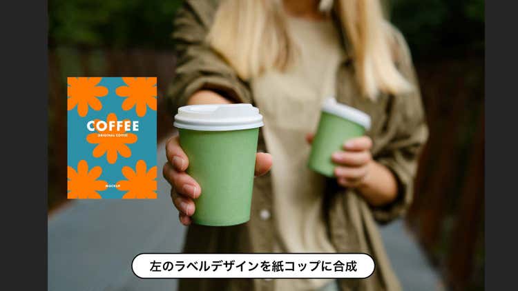 ぼやけたコップや指に自然に馴染むようラベルを合成するのは難しい作業です。ですが、これも「左のラベルデザインを紙コップに合成」というプロンプトで以下のような出力を得られます。
