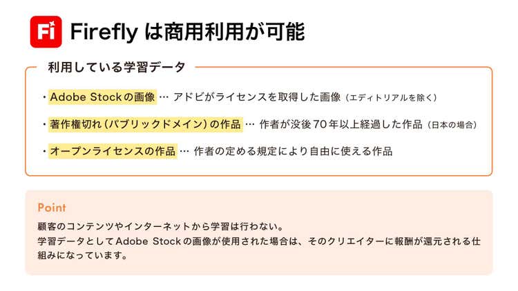 Adobe Firefly は安全に商用利用できる生成 AI として開発されています。パートナーモデルに関しては、それぞれの開発会社のポリシーに安全性が依存します。特にクライアントワークでは、どこまで生成 AI を使っていいかを確認することが重要です。「生成 AI を全く使わない」、「著作権に配慮した生成 AI までは良い」、「アイデア出しにはすべての生成 AI を使ってよい」といったポリシーは、プロジェクトの早期に確定しておきましょう。