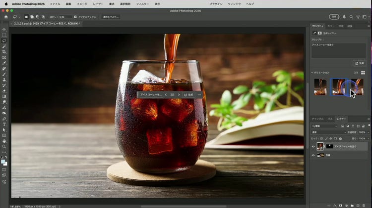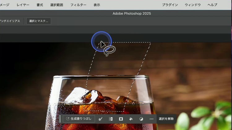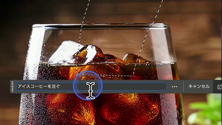 2 つ目の生成 AI 機能です。「生成塗りつぶし」は、画像に新たな要素を追加したり、画像から要素を削除したりできます。たとえば、下の例のように、アイスコーヒーの注がれたコップの画像を、注がれているコップの画像に変えられます。
