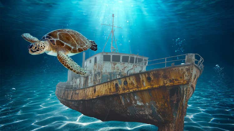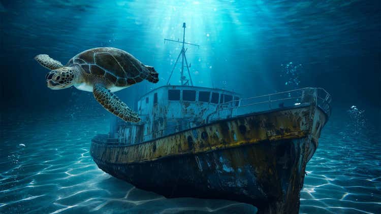 次は、水中の背景です。船と亀の画像を「調和」で馴染ませたところ、水面からの光と水中の青さが反映されました。リアルな沈没船画像のように感じられる出来栄えです。