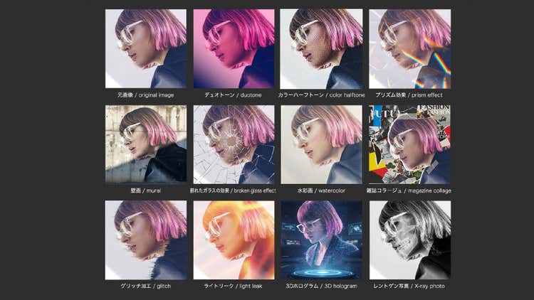パートナーモデルは、画像に効果を加えるためにも利用できます。以下は女性の画像に、様々な効果をプロンプトで追加した例です。