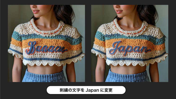 文字編集も可能です。下の例では洋服の胸に刺繍された文字を「刺繍の文字を Japan に変更」というプロンプトで変更しています。このように手作業では難しい加工が容易にできます。洋服の別パターンを検証したいときにサンプルをつくる必要がなくなれば、エコにも貢献できそうです。