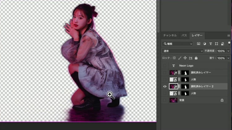 これは「調和」が被写体の周囲に影や反射を生成しているためです。「調和」を実行すると「調和済みレイヤー」が新規作成されます。このレイヤーだけを表示してみると、被写体の周囲に見た目を自然にするための要素が生成されていることが確認できます。