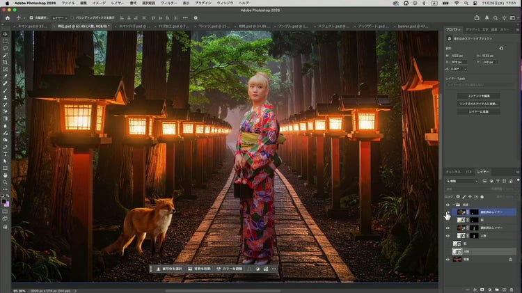 まず、背景画像の上下で明るさが異なるパターンです。下の例では、木々の緑が明るめで足元の石畳は暗めの画像に、着物姿の女性とキツネを「調和」で馴染ませました。配置された位置に応じて明るさが適切に変化していることがわかります。