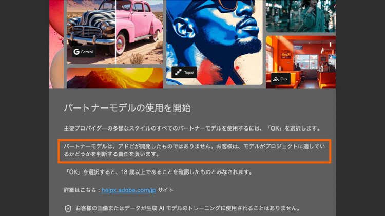 パートナーモデルが初めて使う時には以下のような注意文が表示されます。「パートナーモデルはアドビが開発したものではありません。お客様は、モデルがプロジェクトに適しているかどうかを判断する責任を負います。」