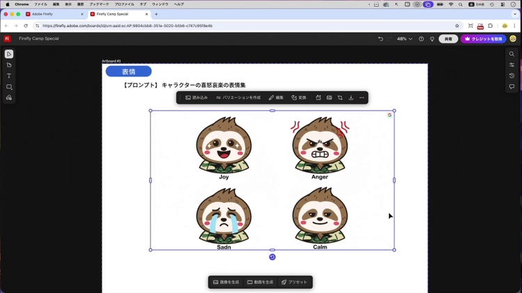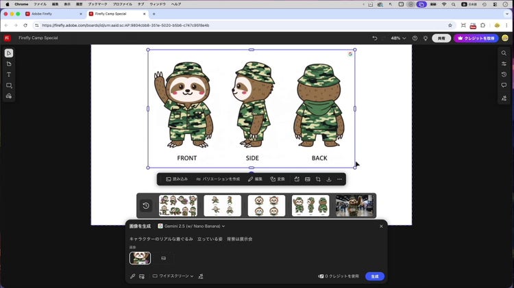 ここからは、Firefly ボードを使ってさらにアイデアを広げる使い方の紹介です。まずは、キャラクターのイラストから、異なるポーズのイラストを生成します。