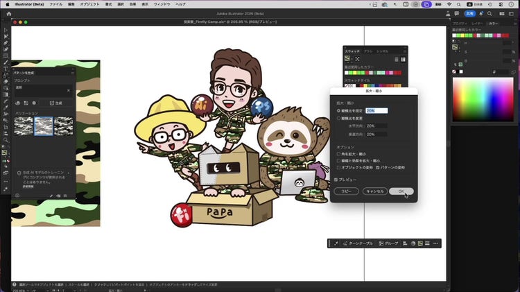 パターンが大きすぎるため、「拡大・縮小」パネルの「パターンの変形」だけがチェックされた状態にして、20% まで小さくしました。これで服の柄は完成です。