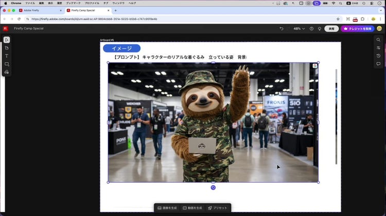 Firefly ボードでは、画像から動画を生成することもできます。セッションでは、上の着ぐるみの画像を素材にした動画生成がデモされました。画像を選択して、「変換」のプルダウンから「画像から動画生成」を選択し、プロンプトに「キャラクターが手を振って喜んでいる」を入力して生成された動画の一部が以下になります。