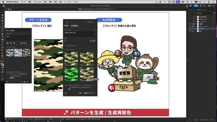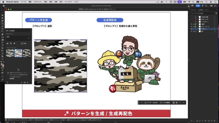 ツールバーの一番下にあるアイコンをクリックして、プルダウンから「独自のパターンを生成」を選択します。「パターンを生成」パネルが表示されたら、プロンプトに「迷彩」と入力して生成ボタンを押します。すると、下図の左側にあるような迷彩柄が生成されます。