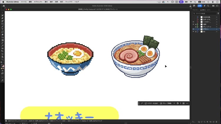 プロンプトに「ラーメン」と入力し、モデルに「Firefly Vector 3」、コンテンツの種類に「被写体」、ディテールに「最低」、効果に「ピクセルアート」と指定して生成ボタンをクリックします。すると、下の左側のような画像が生成されます。右側はパートナーモデルを使用して生成されたイラストです。