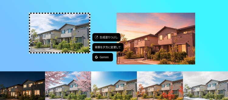 AIによる自動生成で、1枚の写真から昼、夕方、夜などの時刻や、春夏秋冬といった季節のバリエーションを光や影を調整しながら自然に表現することができます。