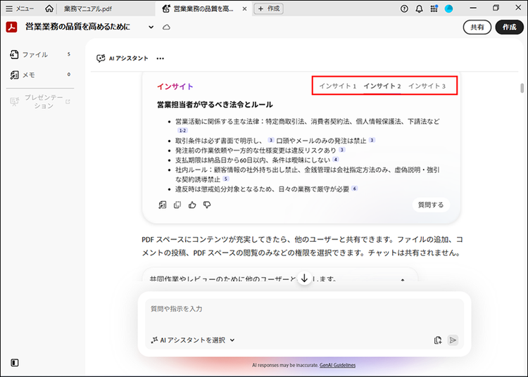 なお、ファイルを追加した直後はインサイトの対象にならない場合があります。その場合は、一旦PDF スペースを閉じてから再度開き直してください。