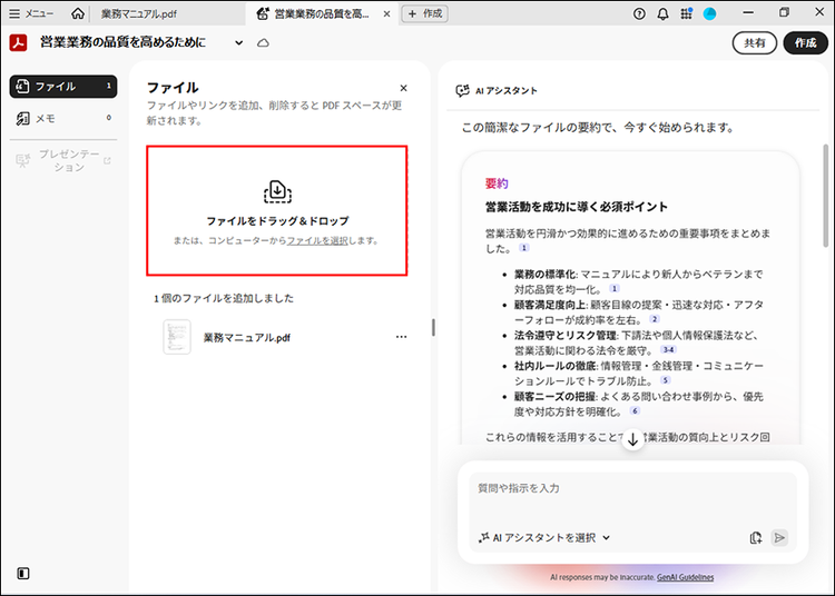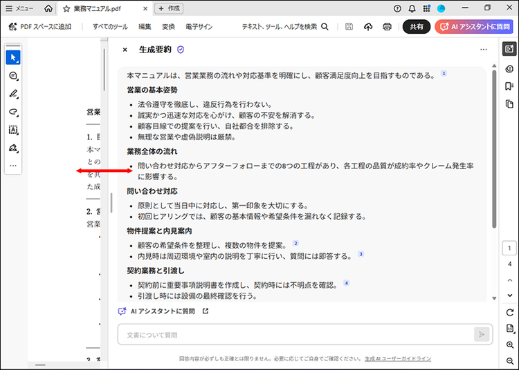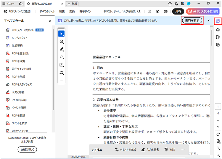 要約するには、業務マニュアルをAcrobatで開いて「要約を表示」または「生成要約」のボタンをクリックするだけです。WordやPowerPointのファイルでもPDFに変換されて要約ができます。