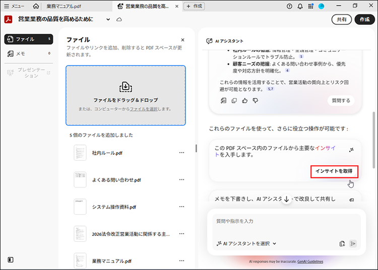 アップロードが完了したら、ファイルの要点を確認するために「インサイトを取得」をクリックします。この機能を利用することで、重要な箇所や注意が必要な箇所をひと目で把握できます。