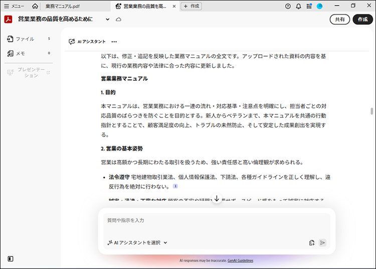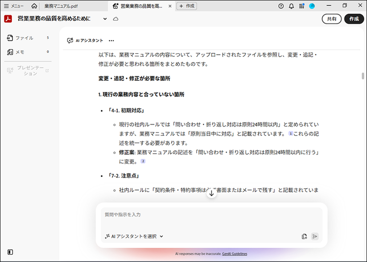 このように、必要な情報をAI アシスタントに渡し、適切な指示を与えることで、業務マニュアルの更新を効率的に進められます。PDF スペースは共有も可能なので、関係者への確認や内容のすり合わせも可能です。