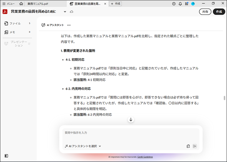 その際、AI アシスタントに「変更が必要な箇所」や「不足している説明」についての質問をします。変更箇所の確認にAI アシスタントを活用することで、複数の資料を横断的に確認でき、人の目では見落としがちな修正ポイントも効率的に把握できるのです。