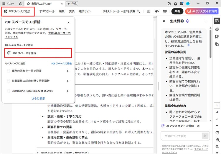 現行の業務マニュアルのファイルを開いた状態で、画面左上にある「PDF スペースに追加」をクリックし「PDF スペースを作成」を選択します。すると、新しいタブにPDF スペースが作成されます。