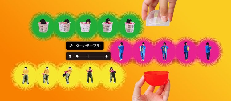 家族の日常写真を自動トレースしてイラスト化し、ターンテーブルで複数の角度のバリエーションを生成。それらをつなぎ合わせて、楽しいカプセルトイの動画ができました。