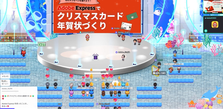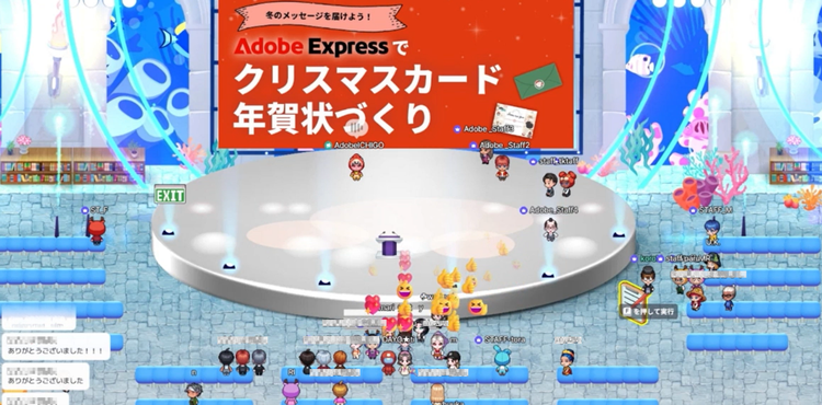 2025年12月24日、兵庫県姫路市が市内の児童生徒向けに運営されているメタバース空間にて、中学生を対象に「Adobe Expressでクリスマスカード・年賀状づくり」と題したAdobe Expressの活用講座を開催しました。アドビの小中高校グローススペシャリスト 渡邉千聖が講師としてメタバース空間の中のステージにアバターで登壇し、つくることの楽しさを届けました。