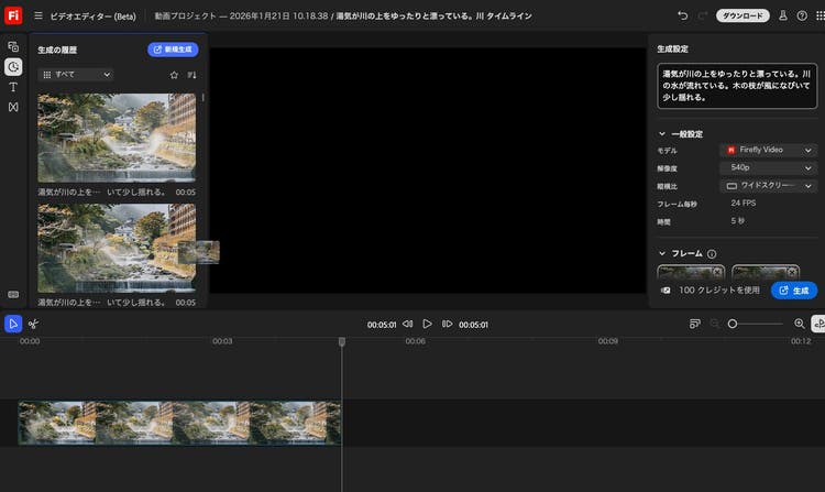 プロンプトに「湯気が川の上をゆったりと漂っている。川の水が流れている。木の枝が風になびいて少し揺れる。」と入力して生成します。