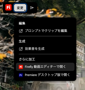 ということで 2 つの動画をつなげます。『動画 ①』を選択して「変更」をクリックし「Firefly 動画エディターで開く」を選択します。(記事執筆時点ではこの機能は Chrome のみサポートされています。)
