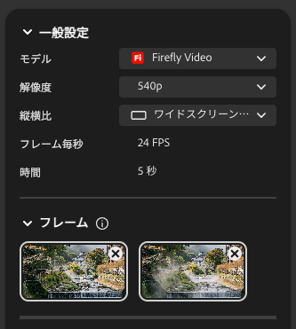 モデルを Firefly Video にして、「最初のフレーム」に『画像 ①』を、「最後のフレーム」に『画像 ②』を指定します。その他の設定はデフォルトです。