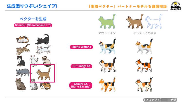 各モデルで実際にシェイプを塗りつぶした結果が以下になります。プロンプトは「三毛猫」で、アウトラインを塗りつぶすケースと、イラストをそのまま塗りつぶすケースで比較を行いました。素材に使用したのは、「ベクターを生成」で Gemini 3 (Nano Banana Pro) を使って生成した猫のイラストです。