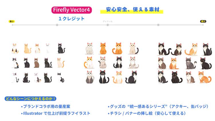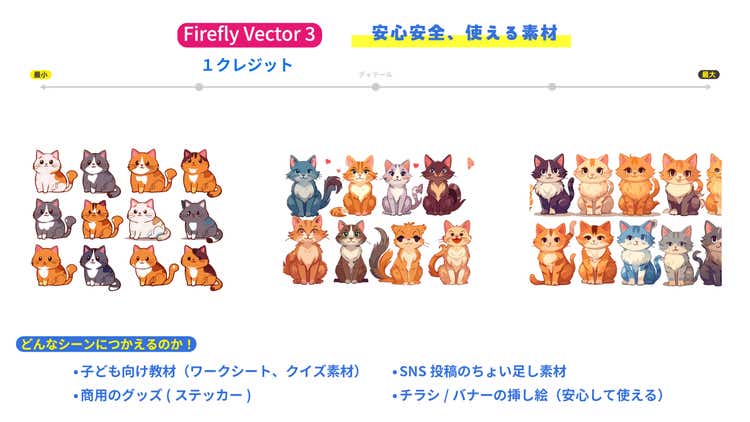 次は Firefly Vector 4 の生成例です。こちらも 1 回 1 クレジットで生成できます。上の例と同様、左から順に「ディテール」の値を最小、中間、最大にして生成した結果です。全体的な統一感があり、Vector 3 よりも使いやすそうなイラストです。