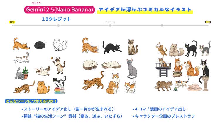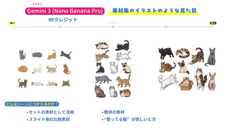 Gemini 3 (Nano Banana Pro) では以下のような生成結果になりました。1 回の生成で 40 クレジット消費しますが、素材集のようなクオリティの高いイラストが生成されています。